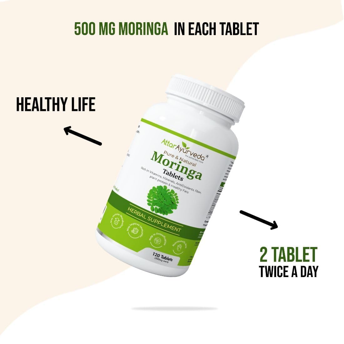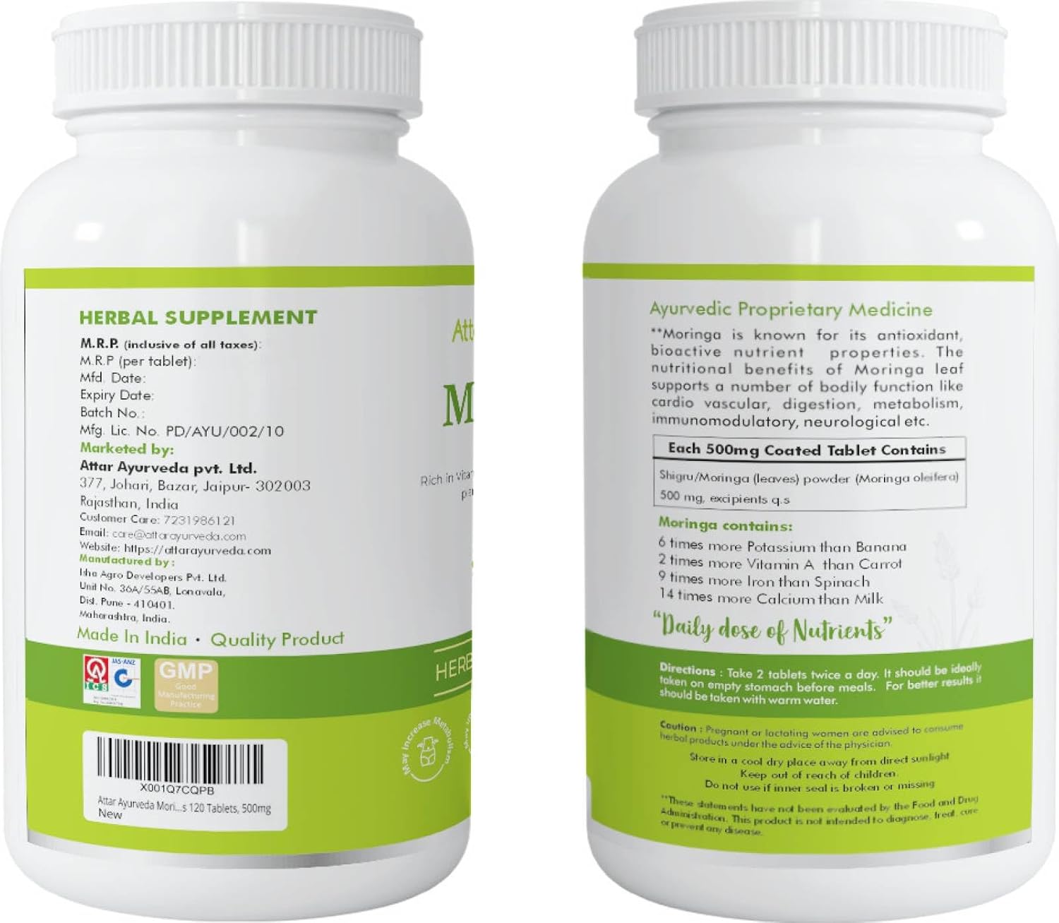 - PURE AND NATURAL: Attar Ayurveda Moringa tablet are free from any pesticides, artificial color or fragrances. It is also approved by AYUSH department