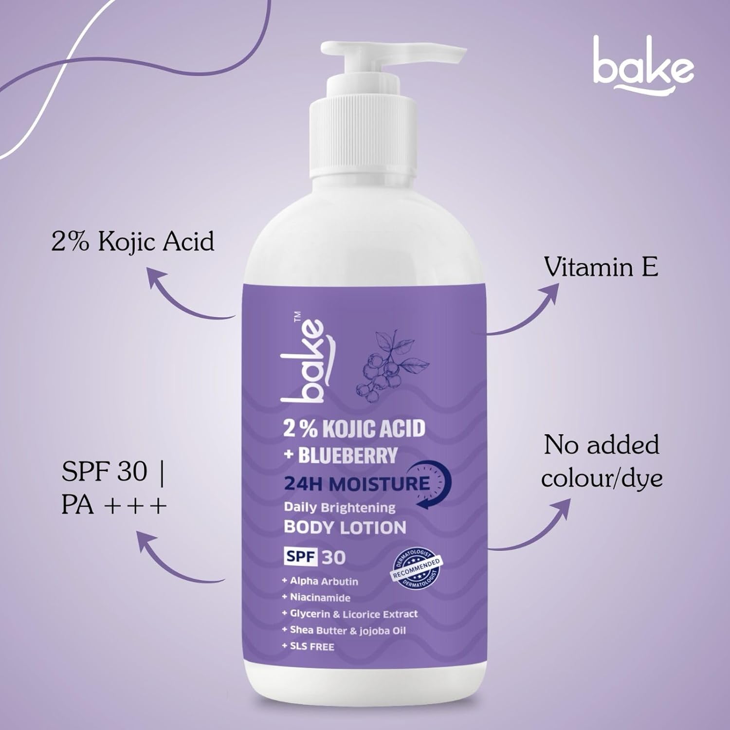 - BRIGHTENS SKIN & IMPROVE SKIN TEXTURE : Bake 2% Kojic Acid Body Lotion is carefully formulated to address the quest for brighter and glowing skin texture in women. With the powerful brightening effects of Kojic Acid, this lotion works to enhance skin radiance and promote a visibly whiter complexion.