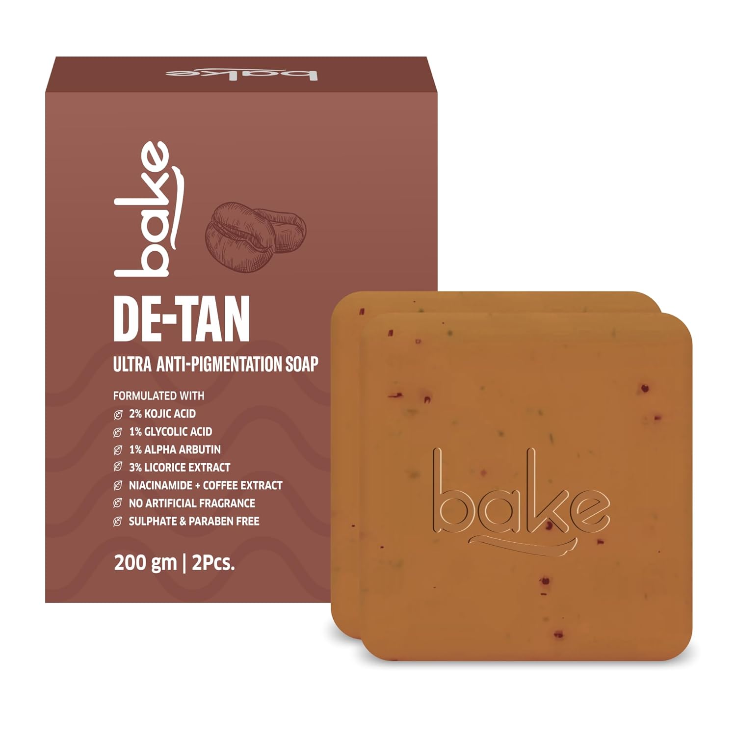 BAKE De-Tan Scrub Treatment Coffee Soap (200Gms Pack of 2) | Ultra Pigmentation Soap for Tan Removal | With 2% Kojic Acid, 1% Glycolic Acid, 1% Alpha Arbutin | | For Pigmentation, Dark Spots & Tan Removal | For Women & Men | 100g x 2