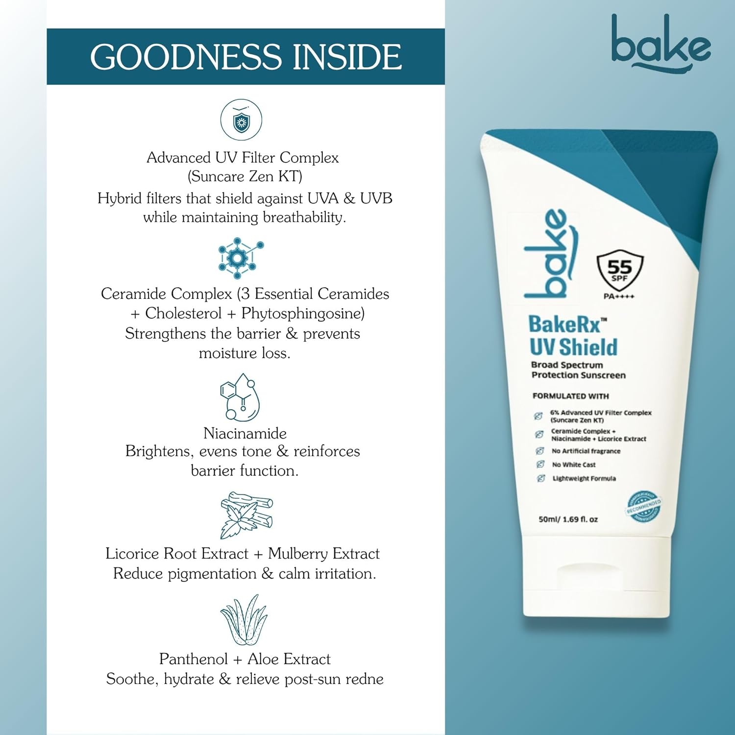 Bake UV Shield Broad Spectrum Sunscreen SPF 55 PA++++ with 6% Advanced UV Filter Complex, 50 gm