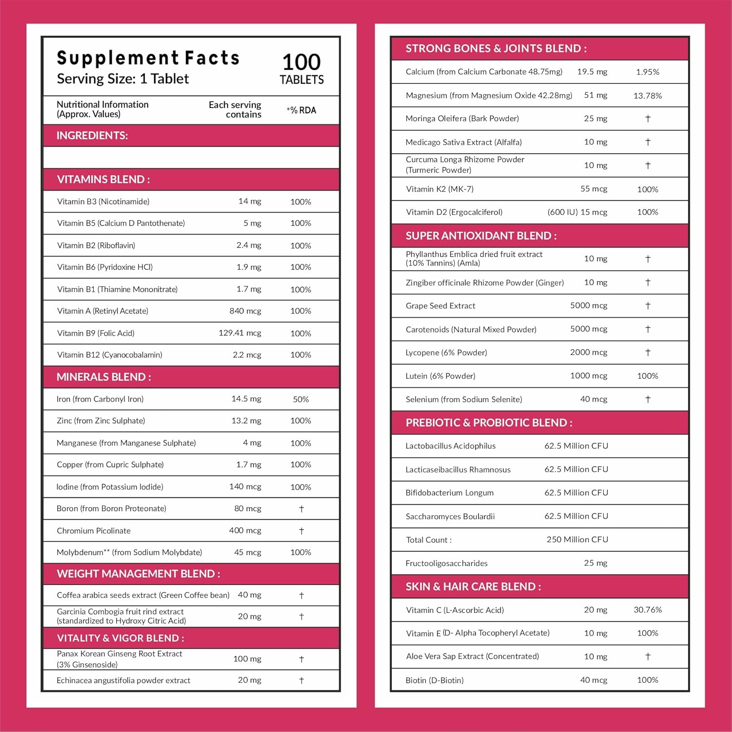 - 1𝟎𝟎% 𝗥𝗗𝗔 𝗢𝗙 𝗠𝗨𝗟𝗧𝗜𝗩𝗜𝗧𝗔𝗠𝗜𝗡𝗦 & 𝗠𝗨𝗟𝗧𝗜 𝗠𝗜𝗡𝗘𝗥𝗔𝗟𝗦 : These women multivitamin supplement with zinc covers your complete dietary requirements by giving 100% RDA of most of the Essential Vitamins & Minerals.