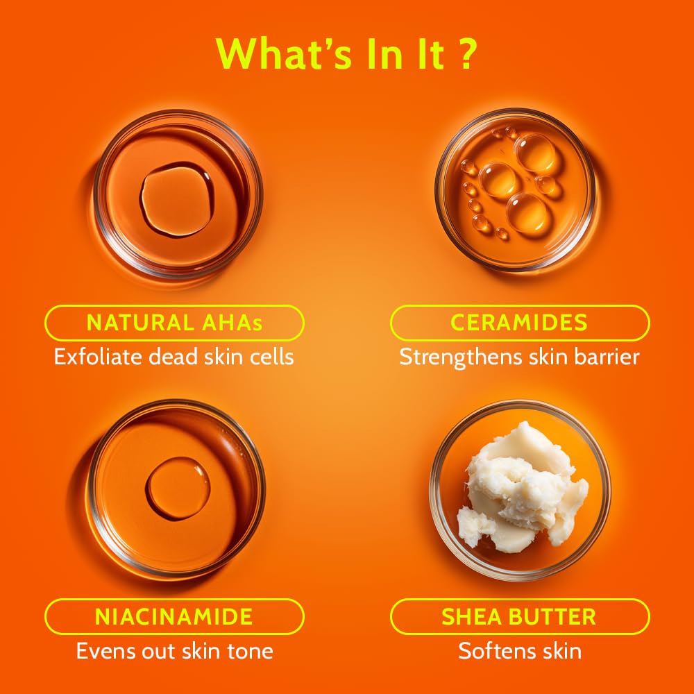 - GENTLE EXFOLIATION: The AHA Body Lotion is enriched with Natural AHA'S from fruit extracts like sugarcane, orange, lemon, sugar maple which exfoliates skin,and soothes without giving any irritation. Hence, the body lotion helps to shed dead skin cells and dryness. This AHA Body Lotion is also good for people who have Pilaris Keratosis i.e. your skin gets dry, rough, patch with tiny bumps and if you get a strawberry leg post waxing (red dots).