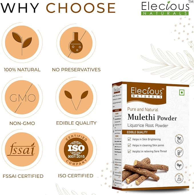 - MULETHI POWDER FOR EATING: Elecious Mulethi powder can be used for eating purposes as it is prepared from high- quality Mulethi
