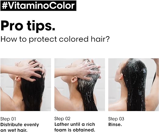 - Apply evenly on wet hair. Lather. Rinse thoroughly. Follow with Vitamino Colour Conditioner.