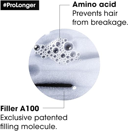 Pro Longer shampoo for long hair helps to thicken your long hair whilst making it visibly healthier and stronger looking. When used with the Pro Longer conditioner for long hair, there is a 44% hair breakage reduction and split ends are reduced visibly by 20%*. The Filler A-100 technology used is patented to L'Oréal Professionnel, and it works by penetrating the fiber core to plump and thicken the hair from the inside. Amino acids in the formula work to strengthen the hair from the outside. The formula works on thin ends, or areas where help is most needed. *Instrumental test using Shampoo and Conditioner