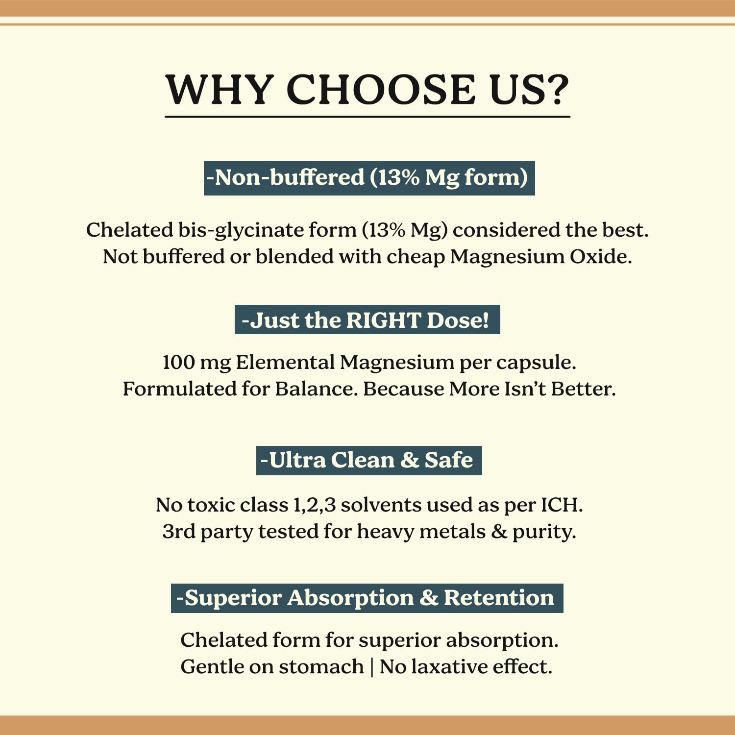 - High Absorption, Non-Buffered Chelated Pure Magnesium Glycinate: Our magnesium supplement delivers 100 mg of elemental magnesium in a true chelated bis-glycinate form — not buffered with magnesium oxide like many other brands. This ensures superior bioavailability, better absorption, and is gentle on stomach with no laxative effect.