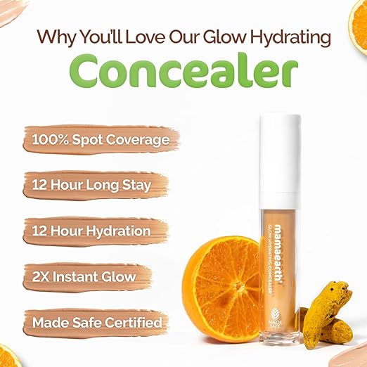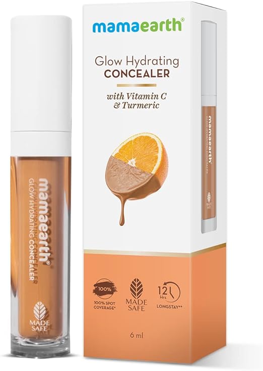 Introducing Mamaearth Glow Hydrating Concealer that does it all, naturally. Crafted with proven natural antioxidants and brightening ingredients like Vitamin C and Turmeric, the Glow Hydrating Concealer gives you 100% spot coverage and 2X instant glow that stays up to 12 hours. Yes, you read that right. Infused with Hyaluronic Acid, the concealer gives you a burst of hydration that lasts for 12 hours. It blends into your skin seamlessly. The result? Flawless skin that glows and stays hydrated throughout the day without caking or creasing! India’s first Made Safe Certified concealer, the Glow Hydrating Concealer contains no toxins. It comes in 3 beautiful shades and is clinically tested to suit all Indian skin tones.