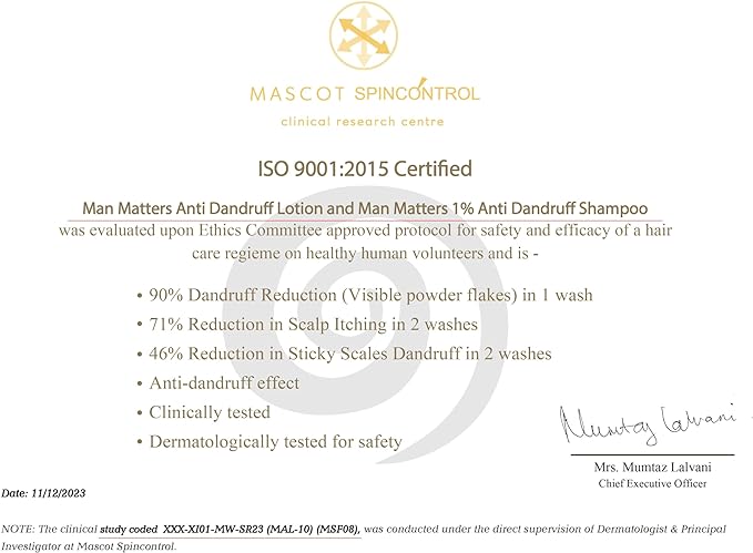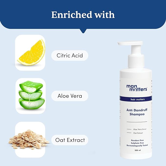 - CO-CREATED WITH DERMATOLOGISTS: Man Matters Anti-dandruff shampoo is specially designed for men, together by a team of dermatologists specializing in Men Hair Health. Made with an effective antifungal agent clinically proven to curb dandruff and inflammation in the scalp, it fights flakes, itchiness, and fungal infections in the scalp known as Seborrheic dermatitis and also fights dandruff due to excess oil in the scalp.