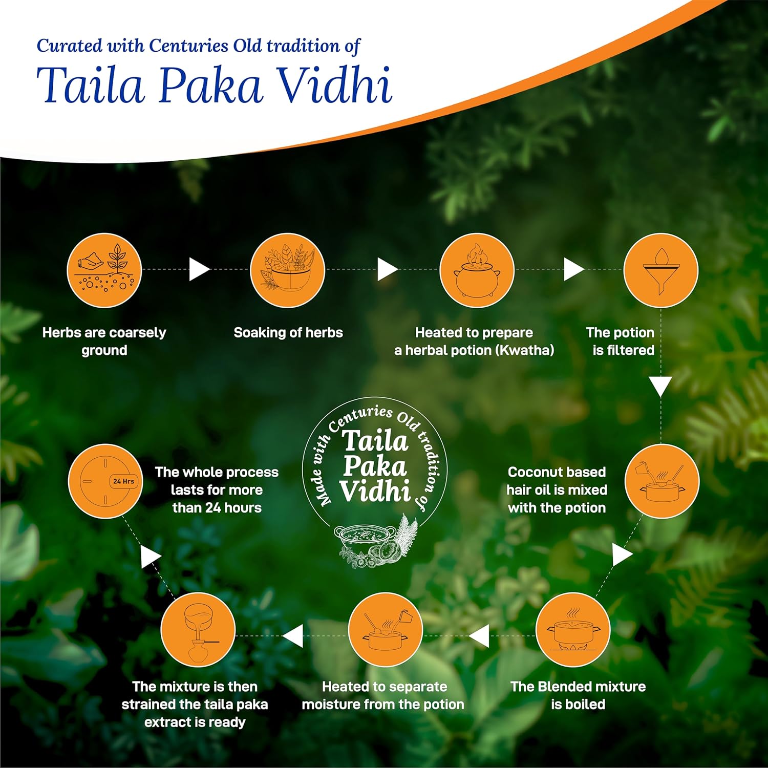 - Tel Pak Vidhi for Maximum Efficacy: This hair oil is processed using the ancient Ayurvedic method, Taila Paka Vidhi, ensuring deep infusion of the herbs' nutrients for enhanced hair fall control and regrowth.