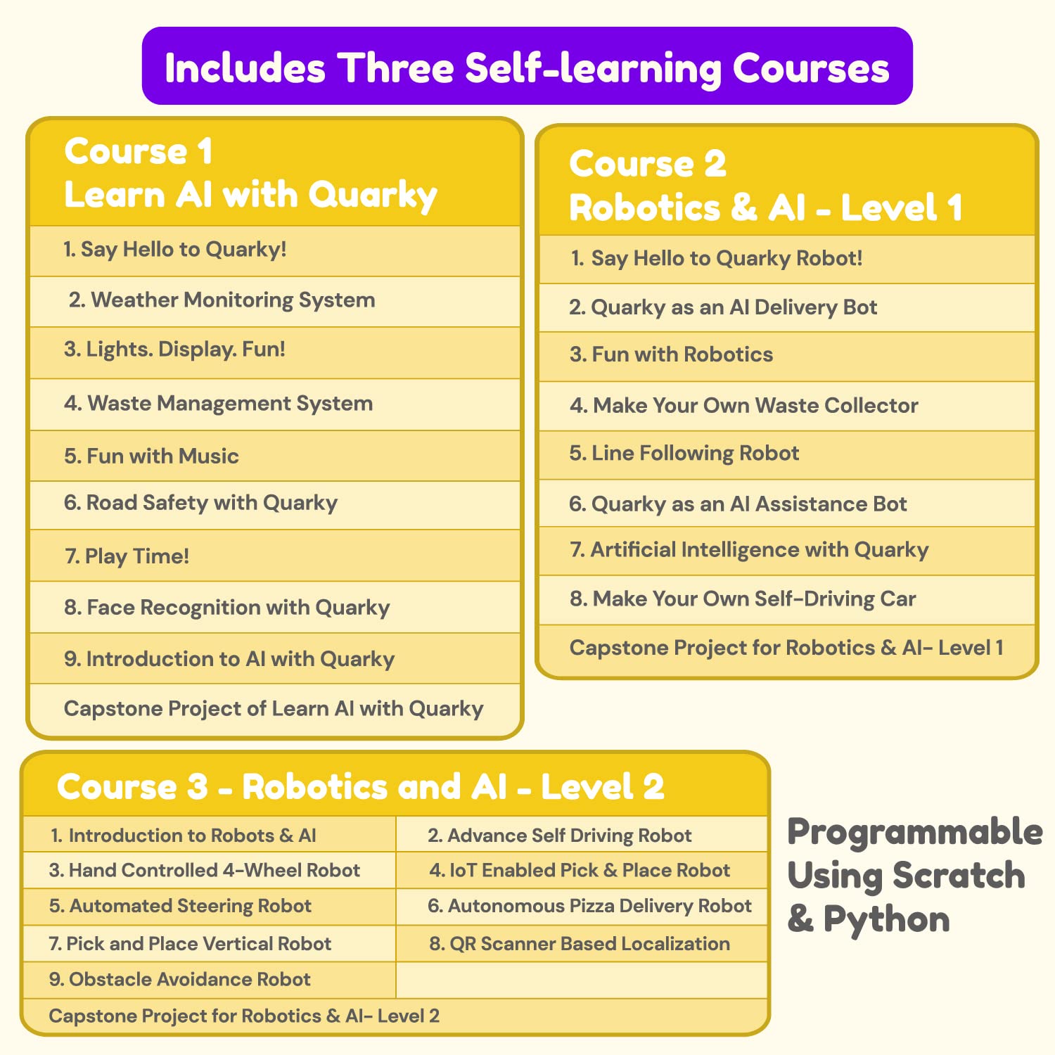 - ONLINE COURSES: Includes 4 self paced courses (12 modules) with Capstone projects on AI & Robotics