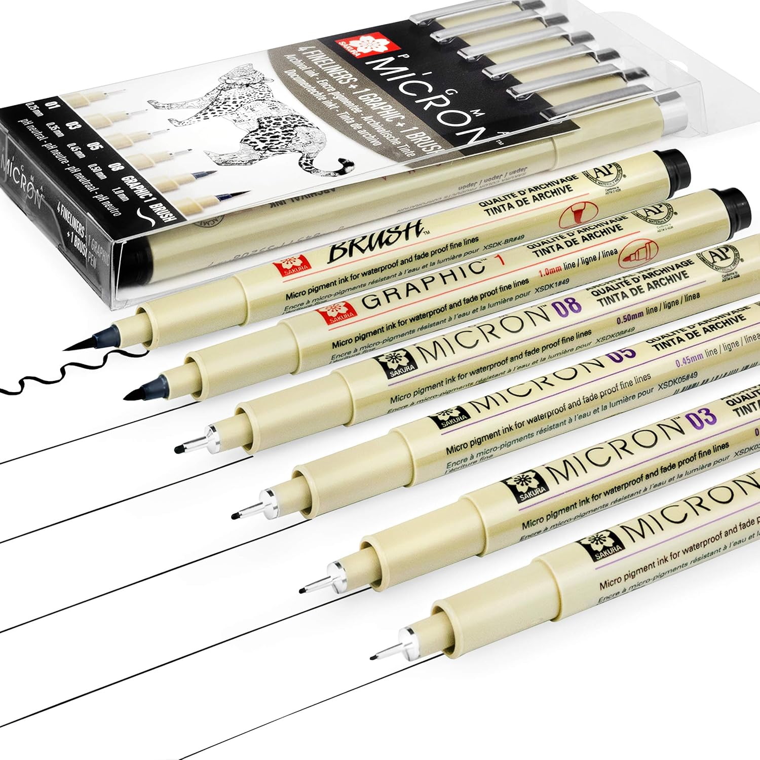 This set contains six pens including four Micron pens in the sizes; 01 (0.25mm), 03 (0.35mm), 05 (0.45mm) and 08 (0.50mm), plus one 1.0mm Graphic pen and one Brush pen with a variable line of 0.5mm to 4mm.