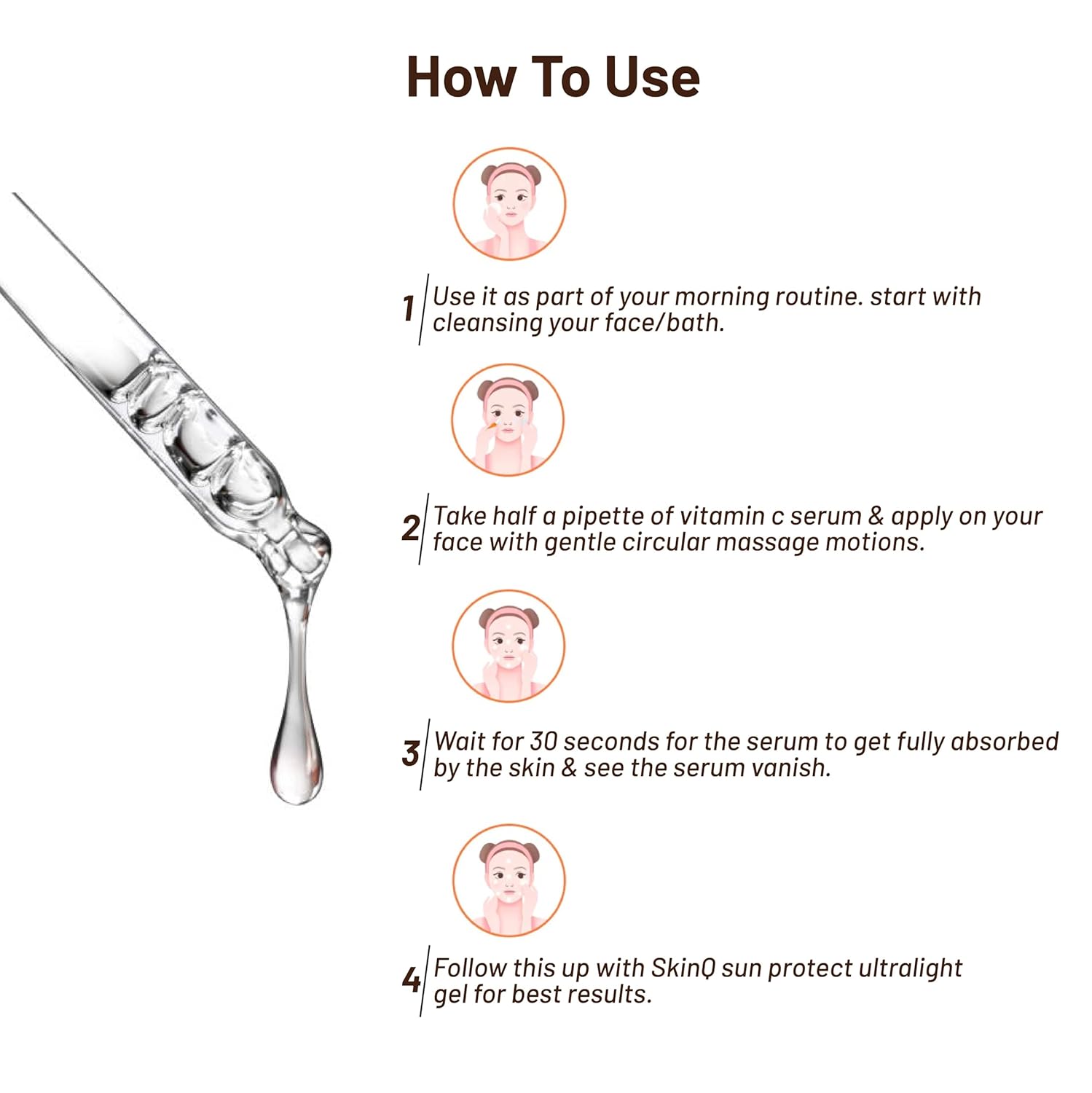 - EASY APPLICATION: Cleanse your face and indulge in the luxury of our Vitamin C Glow Serum. Apply ½ - 1 pipette daily and witness the transformative effects. For ultimate protection, follow with SkinQ Sunscreen Gel SPF 40. Please note, if you have active acne, it's advisable to avoid application. Test patch recommended for sensitive skin.
